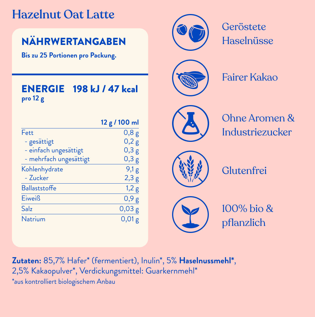 Unser Hazelnut Oat Latte kommt ohne künstliche Zusätze aus – kein Industriezucker, keine Aromen, keine Stabilisatoren, keine Öle. Für den perfekten Geschmack haben wir der Rezeptur geröstete Haselnüsse und hochwertigen Kakao zugefügt.