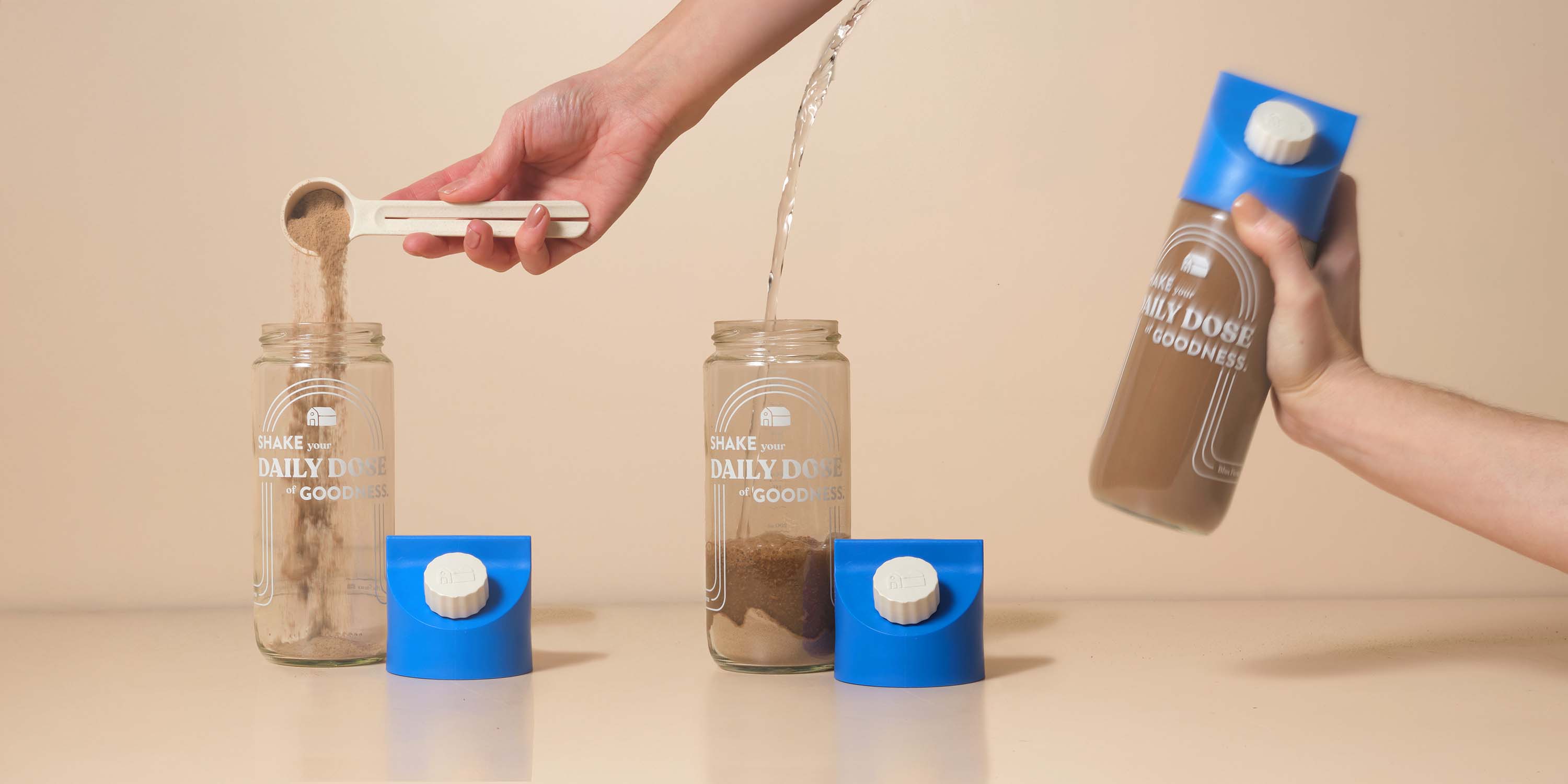 Produktfoto des Hazelnut Oat Latte mit Forever Bottle und Magic Spoon.