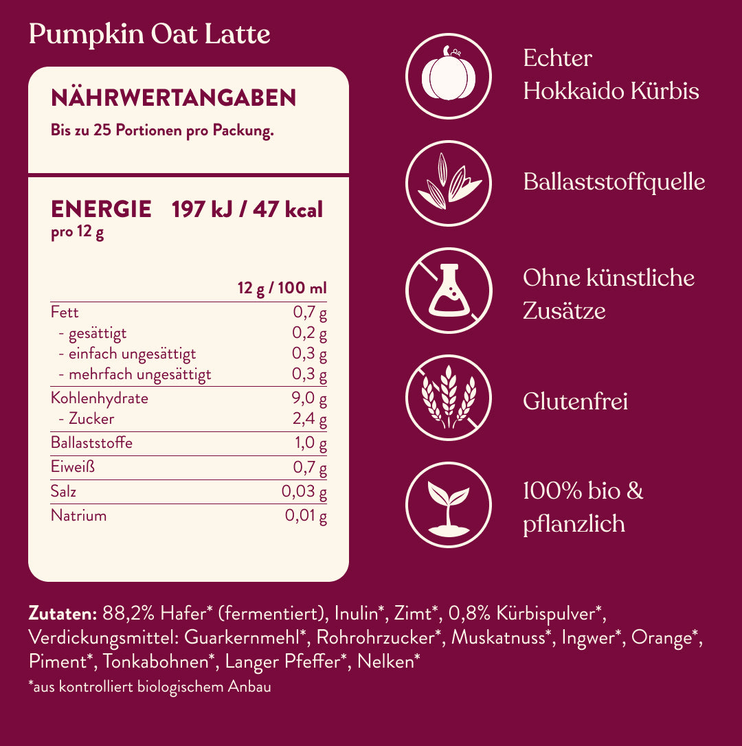 88,2% Hafer* (fermentiert), Inulin*, Zimt*, 0,8% Kürbispulver*, Verdickungsmittel: Guarkernmehl*, Rohrohrzucker*, Muskatnuss*, Ingwer*, Orange*, Piment*, Tonkabohnen*, Langer Pfeffer*, Nelken*